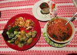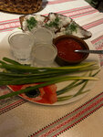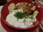 Порции большие, борщ от Солохи отличный, подается с самогоном, лучком зеленым, наивкуснейшей аджикой и бородинской гренкой с намазкой из сала с чесноком. Вареники с картофелем и грибами - порция большая, но по вкусу совсем нейтральные. Сами вареники пресноватые были. Но знаю, что многие любят их вареники. Мне не пришлись по вкусу. Но за борщом однозначно еще вернусь) наваристый, много мяса.