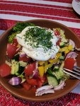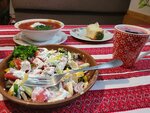 Начиталась отзывов и конечно первым дело поехали сюда на обед) Местечко колоритное . Интерьер украинской хаты, песни , официантки в костюмах — здорово. Заказала борщ и салат Цезарь, с собой вареники с картошкой.  Порции оказались оооочень большие. Я с трудом съела тарелку борща, салата только половину. Первый раз видела в Цезаре болгарский перец ) в целом блюда выглядели аппетитно , все было  вкусно и достойно. В следующий раз сын оцнил куриную котлетку с отварным картофелем. Названия блюд в меню оригинальное.
