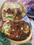 Купил три разных бургера, один был более менее, а два других были практически без ничего. В них было по две котлеты и булочка, а из начинки пару листочков капусты и куча майонеза, хотя там должны быть помидоры, огурчики и я дополнительно заказывал остроты в эти бургеры, но не ожидал только котлеты и хлебушек. Хотя лук жареный добавили в один)