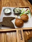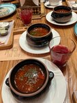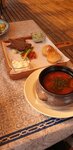 Заказывали борщ. Подача в горшочке. Дополнительно подали дощечку со сметаной, кусочком сала, чесноком и чесночными помпушками, хлебом и вкусной намазкой. Вкусно.