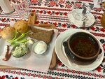 Интерьер перегружен пластиковой растительностью. Борщ - не вкусный, не насыщенный, почти пересолен, лавровый лист не соизволили выловить. Сметана вкусная, смалец шикарный, но занявший зубчик чеснока - это сильно. Солянка слабая, с уже утопленным в ней лимоном с кожурой и косточками, ну и опять лавровый лист. Ну как гостю это вылавливать. Драники оказались не драниками, а толстыми и сухими картофельными котлетами. Удивили способностью испортить такие простые блюда