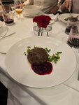 Все собирались и никак не могли зайти. Сегодня выдался момент. Работа привела в центр и выбор пал на знаменитый "Доктор Живаго". Интерьер очень интересный, выполнен в советском стиле с преобладанием белого и красного. Хостес достаточно милые, интеллигентные и приветливые. Ожидание через лист записи составило 46 минут. Официант с первой секунды всячески всем своим видом намекала, что тебе бородатый в трениках тут делать нечего... Хотелось открыть сбер онлайн, чтобы доказать свою платежеспособность и не быть выгнанным раньше времени. Круглый столик на двоих подходит для романтика и первого свидания, но не для пар которые пришли поесть. На стол с трудом умещаются 3 блюда холодных закусок. Что по кухне : 1. Тартар. Классический, подаётся с жареным куском хлеба и чипсами. Мне все понравилось. 2. Винегрет с белыми грибами. Крупно порезан. Капуста маринованная и очень жесткая. Белые грибы теряются на фоне других продуктов. Не зашло. 3. Паштет из курицы с желе. Блюдо интересное, подается с двумя большими ломтями жареного хлеба. Сочетание и пропорции хорошо подобраны. Но блюдо очень сытное. Половину забрали с собой. 4. Холодник со щавелем. Перепробовав массу первых блюд с холодной подачей, могу сказать что это одно из самых удачных! 5. Голубцы с раковыми шейками. Капуста очень жесткая, нежный вкус шеек теряется на фоне соуса и вкуса капусты. Не зашло совсем 😔 6. Бифштекс из оленины с вишней. Мясо на высоте. Сочетание с кисло-сладкой вишней очень понравилось. Я доволен. В общем и целом от ресторана который получал Мишлен, я ожидал сильно большего.
