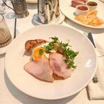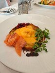 🗓23.10.2025 Гранд-кафе «Dr. Живаго» — это модный и стильный ресторан на первом этаже легендарного отеля Националь. Концепция современной русской кухни. Завтраки проходят до 12ч, мы пришли в будний день и легко нашли место. Цена/качество — 5/5 Что взяли ? • гранд драник с лососем 950₽ — 5/5 🔥 • омлет с томатами и сулугуни 550₽ — 5/5 • слабосоленый лосось 690₽ — 5/5 • блины к икре 220₽ — 5/5 • пирожок на зубок с мясом 90₽ — 5/5 • пирожок на зубок с грибами 90₽ — 5/5 • чай таёжный с шиповником 590₽ — 5/5 Подробнее 👇 гранд драник с лососем - офигенный, мягкий картофельный драник с кусочками свежего лосося, яйцом голандез и карамелизированной брусники, которая идеально дополняет блюдо. Взял бы еще раз. Омлет с томатами + отдельно порция лосося 50гр. Нежный плотный омлет из трех яиц с помидорами и сулугуни. Просто, понятно и вкусно. Слабосоленый лосось хорош. Пирожки на зубок с мясом и грибами смело берем. Маленькие, несухие и нежные. Блинчики и оладушки для икры (без самой икры) приятные. хорошо подхожят для рыбки и икры. Осталось очень приятное впечатление от похода. Ничего необычного и восхитительного не было. Но каждая позиция приготовлена очень хорошо и проверена временем. Именно то, чего и ожидаешь, читая состав. Завтраки Рекомендосьен. P.s. За вид отдельный жирный лайк 👍 P.s.s. Очень демократичные цены относительно расположения и сервиса, который предоставляет ресторан.