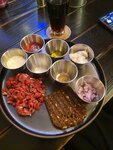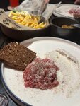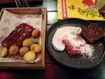 Тартар из говядины и ребра с соусом барбекю на "4". К тартару идёт один кусочек хлеба, чего крайне мало. Рëбра, как-будто не додержали несколько минут. У известного конкурента и вкуснее и дешевле! Пюре с сосисками из детского меню: сосисок нормально, пюре пару столовых ложек, размазанных по тарелке. В WC 3 кабинки, на весь ресторан. Еду принесли гораздо раньше напитков.