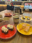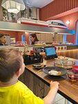 Мы приехали с детьми специально зная что в этом кафе есть детский уголок, увы - нет. Очень удивило что пришлось тащить 2 коляски на второй этаж, нет не пандуса ничего предусмотренного для мам с детьми или людей с ограниченными возможностями. История с тем что ездит поезд с едой классная. Но этот поезд говорит громко какому столу он привез заказ😀 и когда ты сидишь более 30 минут это надоедает. Еда посредственная вкуса любой доставки. Но ооооооочень вкусное мороженое с жареным бананом. За него лайк. За вежливых сотрудников тоже лайк. За то что убрали детскую комнату жирный дизлайк.