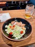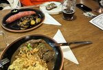 Часто хожу сюда на квизы и, так уж случилось, не пью алкоголь. Иногда беру что-нибудь поесть и, пока что, из меню понравился только паштет. Суп с блинами оказался супом с плавающими в нём мягкими блинами. Есть это было неприятно, лучше бы блины отдельно подали. Салат кахни просто куча капусты заправленная покупным кунжутным соусом за 750р. За такую цену соус можно было бы и самим сделать, а так я и дома приготовлю и ещё лучше получится. Все горячие блюда стоят как полноценные в других местах, но тут идут без гарнира, колбаски абсолютно все с добавлением свинины из-за чего ужасно жирные, хотелось бы парочку чисто говяжьих и куриных. Добавлять в хлебную корзинку вместо масла творог в качестве намазки тоже очень странное решение. В-общем под пиво может и пойдет, но я не пью поэтому 2 звезды