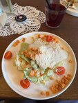 Запланировали с родителями поездку на день в Переславль и до последнего не знали куда пойдем кушать. Думали об этом в последний момент уже на въезде в город. Я выбирала по картам и нам приглянулся больше всего Мясоедъ) все мы любителя мяса. В первую очередь понравился интерьер и атмосфера ресторана по фото, позиции и цены, обрадовало количество машин, сделали сразу вывод - «значит вкусно». С улицы уже чувствовался запах кухни, зашли и почти сразу к нам подошел официант и посадил за столик (нас было трое, мне кажется нам повезло, потому что в субботу в 3 часа там была почти полная посадка)) Сразу подошла официантка Анастасия, она нас обслуживала. Сразу протерла столик, сразу принесла меню и помогла найти розетку, чтобы зарядить телефон. Есть кнопочки вызова официанта - очень удобно. Переходим к меню и блюдам в целом) Меню разнообразное, как по напиткам, так и по всему остальному. Цены не сильно кусаются, мы брали чай хвойный, стаканчик морса, на троих взяли ассорти шашлыков, беби картофель и 2 салата: цезарь и еще один фирменный (название забыли, но фотку прикреплю). Хочется поблагодарить команду кухни - все правда невероятно вкусно. Шашлык мягенький и сочный, подается с луком, шпинатом и лавашем. Картошка тоже очень мягкая в кисло сладком соусе тоже с какими то листиками и луком. Цезарь заслуживает оценку 10/10, не сухой, правильный, с вкусным сыром, свежей капустой и тонко нарезанной курицей - очень вкусно. Сфоткать шашлык и картошку просто не успели, налетели на эту вкусноту сразу как принесли. Кстати принесли все быстро в правильном порядке - сначала напитки, салаты и потом горячее, долго не ждали. В общем нас очень кухня обрадовала, ушли сытые и довольные. Интерьер как у доброго дедушки, все так интересно сочетается, приятно находиться там. Благодарим кухню, благодарим Анастасию - очень хорошая девушка, отзывчивая, очень точно все сработано и по доброму, с заботой, это очень приятно) Мы остались довольны, спасибо команде ресторана Мясоедъ, за гостеприимство, желаем побольше хороших гостей ❤️
