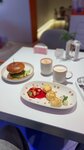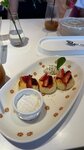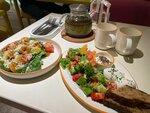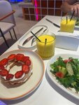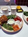 Популярное Инстаграмное кафе с прикольным интерьером и ценами ресторанного уровня, вежливый персонал и вкусная кухня и очень эстетичная, визуальная составляющая на очень высоком уровне, но не без недостатков. От салата с обжаренными креветками ожидалось, что морепродукт будет хотя бы теплым, не то что горячим, но они были совершенно холодные... Хоть сочетание с апельсином и грейпфрутом отличное дополненное сладким соусом. Позиция завтрака хороша, авокадо мягкое. Испортить объективно было практически невозможно. Так что там без вопросов. Птичье молоко — кайф. Мягко и нежно. С творожным кольцом, к сожалению, не так все радужно. Само тесто оказалось очень твердым, так что еле справились ножом. По ощущениям как-будто вчерашнее. Крем хороший и в достаточном количестве. Не смотря на недостатки блюд, они были вкусные,