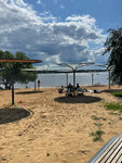 Чудесный пляж! Вода чистая, на дне песок, спуск в воду с лесенки, загорать можно на травке на территории. Есть кафешки и разливные напитки. Пляж оборудован кабинками для переодевания и туалетами. Большая платная парковка, на территории есть мини-зоопарк, можно привезти капусту и морковку, чтобы покормить животных.