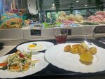 Вся еда, которую мы с мужем пробовали, была свежей, вкусной, разнообразной. Выбор гарнира, мяса, рыбы, салатов, овощей, сладостей и т.д. велик. Никакого запаха, как здесь пишут в комментариях, я не услышала, не видела, чтобы кто-то трогал пищу руками. Персонал отзывчивый. На весах вес тарелки естественно вычитали. Чек всегда давали. Только сейчас работает оплата наличкой, оплата картой не работает (может для кого-то это минус). Видела как сотрудники мыли столы, мыли пол и т.д., то есть уборка проводится. А вот могу сказать за некоторых посетителей, что они ведут себя как свиньи. У нас на двоих (муж и я) обед-ужин выходил на 1400-1500, завтрак - около 1000. В кафе/ресторанах на двоих ценник выше. Снизила звезду за то, что цена за вес овощей, гарнира и мяса одинаковая (135 руб за 100 г).