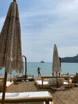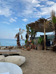 Красивый, удобный пляж с песочком, горами и иногда встречаются камни. Вода прозрачная, видно даже ноги в воде. Есть удобные раздевалки, душь, качели, шезлонги, мягкие диванчики. Правда цена за аренду мне кажется завышена. Там очень уютно, звучит красивая музыка возле кафешек. Разного плана кафешки. К вечеру диванчики лёгким движением руки превращаются в столик с мини диваном, играет живая музыка, переходя в дискотеку и танцами. Цены немного кусаются на еду и алкоголь, но хороший кальян, обслуживание хорошее.