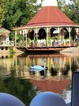 Есть банкетный зал и беседки, очень красиво. 2 лебедя, кормушка с платным кормом. Отовсюду музыка, люди празднуют кто свадьбы кто дни рождения, атмосфера праздничная) есть и те кто просто посидеть зашёл. Есть кальян, персонал приветливый, еда вкусная. Если холодно можно взять плед.