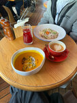 Некоторые блюда приготовлены особенно изыскано, можно помычать от удовольствия! Персонал, как пчелки неустанно трудятся и весьма любезны и отзывчивы (например: заранее столик мы не заказали и нас посадили за маленький столик, но мы попросили пересадить нас за большой, как только будет свободен и в теч 20 мин нас пересадили, но и ланч у нас был на 7000). Круасаны с шоколадом заказали дважды, настолько вкусные. Горячие блюда с говядиной понравились, но тут всегда дело вкуса. Локация уютная и после ланча живописно погулять в округе.