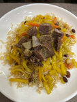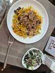 Очень все просто, в меню две позиции: плов порция и плов 0.7 порции, добавки в виде колбасы, яйца, жареного курдюка или доп порции мяса, пара салатиков. Плов бухарский, с изюмом и нутом, очень вкусно.