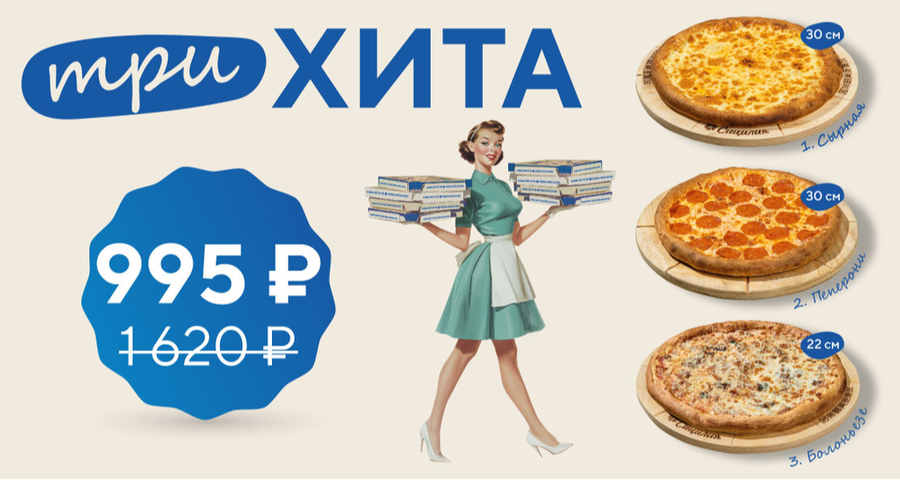 3 легендарные пиццы всего за 995 руб. Невероятно выгодно!