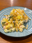 Состав: удон, креветки, куриное филе, шиитаке, жареный арахис, болгарский перец, кабачок, морковь, репчатый лук, чеснок, имбирь, зелёный лук, устричный соус, соевый соус, кунжутное масло, арахис, кунжут, кинза