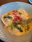 С первых минут впечатлил уютный интерьер, приглушённый свет делает обстановку очень комфортной. Обслуживание и отдача блюд быстрая, официант внимален. Пицца 4 сыра очень вкусная, сыра много, когда берешь кусок он очень эффектно тянется) Равиоли с креветками тоже понравились, соус отличный Шницель мягкий, сочный, вкусно, но не впечатлил, но это просто блюдо без особых ожиданий на вау вкус. А вот порция удивила, шницель просто огромных размеров) Чай с имбирём и каламанси хороший, не приторно сладкий,но перетертого имбиря много, пить не очень комфортно Единственная проблема почему-то абсолютно всех ресторанов-отсутствие на входной группе пуфов/стульев для того, чтобы комфортно раздеться/одеться.