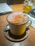 Хорошее заведение. Давно хотел его посетить, но почему-то долгое время не получалось это сделать. Внутри приятно, веранда теплая и светлая. Есть пара вопросов к тому, что почему у них уже наступил Новый Год уже 8 ноября(будто у меня целый месяц украли осени), но это вкусовщина. Что по еде - а это я считаю главное. Заказал пасту от шефа в пармезане и брускетты с томатами. Что касается первого блюда - к нашему столику подошёл шев заведения, вместе с официантом они выкатили тележку с огромной сырной головой и плиткой, и реально начали готовить при мне пасту. Шеф, несмотря на то что был молод, явно разбирается в приготовлении еды. Пока готовил, рассказывал историю этого блюда, и вообще был крайне мил, приятен и вежлив. Пасту в итоге приготовили на курином бульоне, сливках и самом сыре(сырную голову грели изнутри горелкой, сыр попался, таял, а потом в него окунали пасту). В общем, помимо эстетического визуального удовольствия, остался очень доволен и ее вкусом. Советую всем! Но, с небольшой оговоркой. Паста жирная (все же сливки 33 процента + сам сыр), поэтому у кого проблемы с желудком, заказывайте на свой страх и риск. Брускетты тоже оказались вкусными, но это простенькое блюдо и разглагольствовать на эту тему не имеет смысла. Хлеб, помидоры(кстати вкусные, сто главное) базилик, сто ещё нужно?!) Правильно - ничего. Помимо своих блюд попробовал еще тыквенный суп с креветками - нежный, вкусный, но как по мне недосоленный (опять же вкусовщина) Плюс попробовал пирог с ягодами - приятный, но восхвалять не буду. Расстроил только чай. Пакетный и не вкусный. Только из-за него хотел поставить 4, вместо 5, но не стал, так как это было бы не честно к поварам. В общем, советую. Особенно зимой, когда новогодние украшения будут актуальны) По всем вопросам, можете писать мне лично собакаDensisor. Ешьте вкусно, и приятного вам аппетита!)