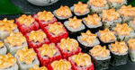 Состав: нори, рис, тигровая креветка, сыр креметте, снежный краб, авокадо, фирменный сырный соус, икра тобико оранжевая (8 шт.)