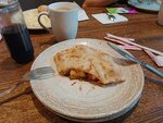 Блин с беконом, картофельным пюре, маринованными огурцами и жареным луком