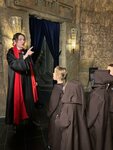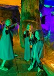 Впечатлила территория и разрешение на съёмку, а снимать было что. В клетках сидят разные монстры, некоторые даже общаются (Граф Дракула, например). Много артефактов за стеклом, можно их активировать палочкой. Тут тебе и ящик Пандоры, и Медуза Горгона, и Философский камень, и Аленький цветочек, и много ещё чего. И викторины интерактивные с зеркалом волшебным, и ещё мини-квест в конце - прекрасно погуляли после самой программы. Сказывается соседство с Океанариумом: в водоёмах плавают яркие карпики) Есть настоящий водопад и звёздное небо! Звёзды падают, желания загадываются) Ну и о самой программе. Мы попали на зелёный факультет Эрдегор. Палочка у нас уже была, поэтому не знаю, как её выдают, с фокусами или без) В гардеробе при сдаче одежды никакой магии не было (а в Министерстве была). Надели зелёные мантии, взяли зачетки и отправились знакомиться и учиться. Дети сыграли в палочки по типу Форта Баярд (тянем по очереди, надо оставить соперника с последней палочкой). Группа у нас была большая, разбили на две части. Выучили по ходу пару заклинаний. Урок "Создание иллюзий" — с юмором, с примерами 🔥 "Иллюзия существует? Да! А если вы видите то, чего не существует, то это галлюцинации." После отправились сдавать экзамены, а попросту — проходить квест в специальных комнатах. Вот не знаю, как бы справились наши 7-8 летки без родителей, мы вместе еле-еле одолели пару заданий (вставить печать в клетке и использовать цифры "с умом", расшифровав заклинания)😂 Остальные задания попроще. Здесь тоже разбились на группы и у каждой группы были свои задачи. В итоге всем надо было найти шестерёнки для дракона огнедыдащего. В конце все встретились, вставили шестеренки, получили по кусочку волшебной сферы (браслетик) и пошли гулять по территории. Ведущие в Визардии нам встретились разные, по вовлеченности и артистизму.