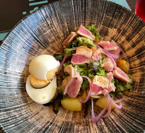 Стол бронировали накануне. В четверг вечером была полная посадка. Работает только веранда. Для одного раза пойдет, посидеть, пофоткаться. Для второго раза выбрала бы что-то более вкуснее и поинтереснее. Туалет этажом ниже, детская комната тоже этажом ниже. То есть либо ты голодная с ребенком в комнате, либо сытая, но ребенок путается под ногами, потому что веранда не предназначена для детей. Еда денег своих не стоит точно. Есть можно, но не вау вообще. Официант не знает состав салатов. Сказала что в салате с тунцом идут ГИГАНТСКИЕ МАСЛИНЫ, в итоге было 2 половинки обычной маслины на весь салат. Листья салата были жухлые и потемневшие. На куриное яйцо прилипла пыль. На фото видно. Паста с курицей и грибами посредственная. Лимонад со смородиной понравился, но это просто вода с сиропом. Для одного раза ок, второй раз ни за что.