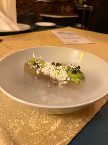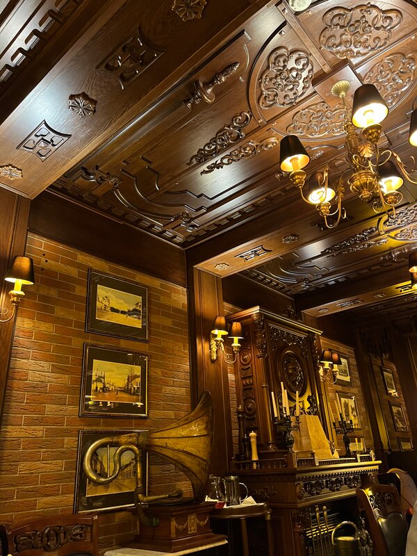 Очень красивый интерьер из натурального дерева. Оригинальная подача некоторых блюд. Очень понравился десерт Павлова и холодец.