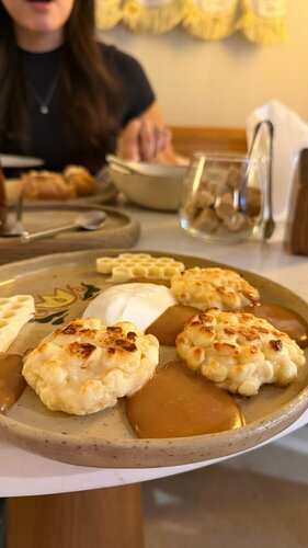 Очень милое кафе с татарским названием, спокойным, светлым и современным интерьером — всё выглядит аккуратно, приятно и довольно эстетично. Такое место, куда хочется зайти не на бегу, а спокойно посидеть. Что мне показалось интересным: в меню татарские блюда смешаны с довольно привычными и даже уже почти обязательными для городских кафе позициями — типа боулов или сэндвичей. Да, они адаптированы «на татарский манер», но всё равно это немного необычно. С одной стороны, я не до конца понимаю, насколько это уместно именно в туристической зоне, где, казалось бы, хочется более аутентичного опыта. С другой — возможно, владельцы хотели сделать место более понятным и комфортным не только для тех, кто целенаправленно идёт за татарской кухней, но и для людей, которым хочется чего-то более универсального и знакомого. Из формата обслуживания: заказ нужно делать самостоятельно на кассе. Для меня это не самый любимый вариант, но, к счастью, дальше всё уже комфортно — блюда приносят официанты, а не нужно потом стоять с подносом и искать себе стол, как в фастфуде. И ещё момент, который мне очень понравился: при заказе сразу честно озвучивают время приготовления. Например, нам сразу сказали, что сырники будут готовиться около 20 минут, потому что их запекают. Это, правда, очень удобно и приятно — ты сразу понимаешь, чего ожидать, и не сидишь потом в недоумении. Я заказала сырники с творогом, потому что мне было интересно посмотреть на подачу с солёной карамелью и белым шоколадом. Сами сырники — такие очень домашние, зернистые, прям с характером, и в этом есть свой плюс. На вкус — действительно хорошо. Но вот подача для меня получилась немного спорной. Солёной карамели было прямо очень много, плюс сметана, и визуально всё это смотрелось немного перегруженно. Не супергастрономично-эстетично, скажем так. И ещё отдельный момент: белый шоколад оказался не в виде какого-то соуса или крема, как я почему-то себе представила, а просто кусочками. Возможно, если бы я уточнила это заранее, ожидание было бы другим, но на кассе я не спросила. В итоге вкусно, но визуально и по подаче, как мне кажется, можно было бы сделать интереснее и тоньше. Ещё мы взяли татарский чай с душицей — и вот он мне очень понравился. Насыщенный, ароматный, очень приятный вкус. Я прям с удовольствием выпила весь чайничек, а для меня это уже показатель. И отдельно хочу сказать про очень милую деталь, которая меня реально зацепила: у них есть бумажная кукла с нарядами, как в детстве. Вот это вообще супер тёплая и классная идея. Мне кажется, это такой маленький, но очень удачный проект — можно и ребёнку подарить, и себе оставить на память, и вообще это очень симпатичный способ познакомить людей с татарской культурой через что-то простое, красивое и ностальгичное. Цена правда кусачая ((( 940₽. В общем, место приятное, с атмосферой, с интересной концепцией и милыми деталями. Не всё мне откликнулось на 100% по еде и подаче, но в целом впечатление осталось хорошее. Такое кафе, куда приятно зайти хотя бы ради атмосферы, чая и вот этих небольших культурных находок