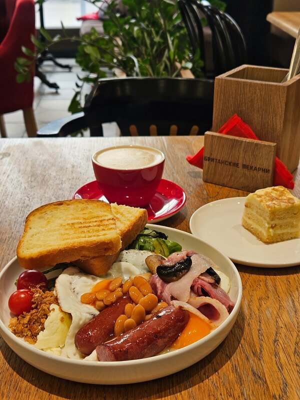 Зашла за каким нибудь десертом, осталась на вкусный завтрак. Всё очень понравилось, приятная атмосфера в целом, ненавязчивая музыка и красивый интерьер. На фото: английский завтрак, маленький капучино и 1/2 сметанника