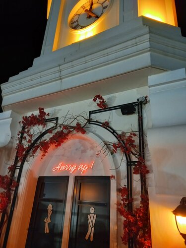 Башня и правда там есть. Она и правда новодел. Мы один раз попили кофе в её кафе внизу на улице, а во второй раз всё таки поднялись на верх. Для этого было две причины. О второй чуть позже. На верх ведёт не широкая лестница, которая к тому же постепенно сужается в конце. Кухню не пробовали, но кофе "американо" такой, что у некоторых "эспрессо" слабее. Персонал работает без задержек, но и не стоит над душой. После еды не надо просить счёт, просто оплачиваете в кассе у выхода. Карта Юнион Пэй от Россельхозбанка сработала. Но вот, если разобраться, вид вечером с площадки башни никакой. В добавленных фото это можно увидеть. Теперь про вторую причину. Просто понадобился туалет, на площади перед башней он был, но платный. А в кафе их аж два и бесплатные. Ещё один снимок показывает не туалет, а то что часы не работают. В общем хочу сказать, что башня не столько хороша кафешкой, сколько для туристов является отправной точкой. Вся логистика завязана на ней.
