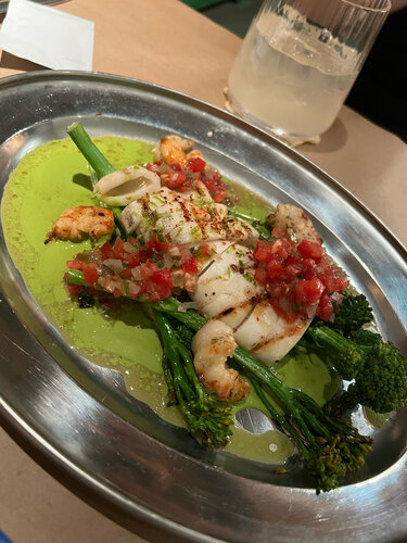 Очень люблю проекты Dreamteams, но этот ресторан вызвал полное разочарование. Очень не понравилось мелко написанное меню. Оно настолько нечитабельное, что у меня не было никакого желания его разбирать и я ждала официанта. Официант пришел, но из-за громкой музыки, шума я еле могла расслышать, что она говорит, мне приходилось наклоняться к ней ухом и это выглядело странно. Официант говорила заученный текст, я была очень удивлена, потому что обычно в ресторанах этой группы официанты очень общительные и креативные. А тут сухой текст.. официант не помогла нам с выбором, каждый раз приходилось спрашивать, что означают эти вычурные слова (приготовьтесь, их будет много, поэтому все меню- это абракадабра). Я попросила сориентировать по барной карте, конкретно по винам. И получила шикарный ответ: тут такие сезонные вина, а тут другие. Еда. Разочарование. Была жара, было желание взять морепродукты. Были взяты птитим и кальмар - не хватило вкуса, очень пресно, кальмар резиновый, птитим и зеленый горошек пресные. Я бы добавила чеснока, заменила горошек хотя бы на миниброкколи для сочности. Это блюдо очень невзрачное за такую цену. Так же взяли брокколини с морепродуктами. Тот же резиновый кальмар и жалкие кусочки креветок, лежащие на огромном слое соуса из масла. Было ощущение, что наелся масла. Ну и немножко томата и перца для разнообразия. Напитки: лимонад базилик и лайм. Надеюсь хотя бы 100 мл лимонада мы получили, так как в стакане был только лад. Еще было много странных моментов от официанта, но уже сложно все пересказать. Мой вывод. Очень слабо. Хоть мне и сказали, что Poly- это греческо-ливанская авторская кухня, по факту как будто обдурили. Возможно, надо было брать мясо, но 2х ключевых позиций в меню не было, а брать 3е блюдо на пробу было страшно, тк было ощущение, что и в мясо добавят много масла