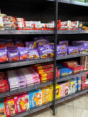 Прикольный магазин с зарубежными сластями по доступной цене. Так же там продается выпечка и не только сладости, но и перекусы, как и вредные так и пп, так же там большое разнообразие напитков