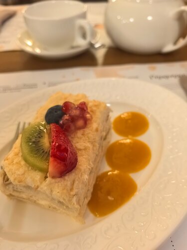 Вычитала в отзывах про шикарный Наполеон в этом ресторане. А тут как раз вечером после активного дня мимо проходила... Наполеон действительно прекрасен! Даже не так... Великолепен! Нежнейшее наслаждение! Не слишком сладко, не пресно, ощущается игра вкусов. Но восхитило в первую очередь другое... СЕРВИС! На высочайшем уровне! Ресторан до 23. Я зашла в 22:15, никакой агрессии, никаких недовольных взглядов. Меня спокойно, вежливо предупредили, что кухня до 22:30, а потом быстро, максимально качественно и приветливо со мной отработали. Такое должно быть всегда и везде, да. Но бывает, увы, редко, когда официанты и сотрудники в последний час работы действительно приветливы и приятны. Искренне благодарю за волшебное окончание того дня 💕