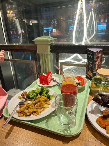 Отличное кафе. Много посадочных мест. Большое разнообразие блюд, приготовьте кошельки- цены не высокие, но всё так аппетитно выглядит, что хочется попробовать всё! Еда вкусная и свежая. Столик немного ждали, т.к. в новогодние каникулы народу много. Персонал вежливый, столик убрали после предыдущих посетителей сразу!