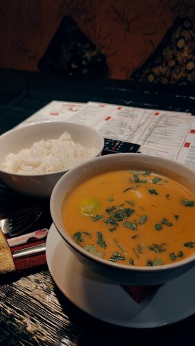 Экзотический ресторан 🐲✨ Сюда нужно приходить, если хочешь попробовать этакого, необычного 🍜🧭 Поизучайте меню — найдете много интересного 😉 Если будете брать том-ям, то обязательно дополнительно закажите рис 🍚 Его нужно заказывать отдельно — там разные виды есть. Без риса нельзя, иначе будет очень остро 🌶️ Еда очень качественная, после неё — долгое приятное послевкусие 😌👌 Декор в ресторане шикарный — можно классно пофоткаться 📸🌺 Есть кабинки для небольших компаний 👥 Только непонятно, зачем они туда ещё и телевизоры повтыкали 📺🤷‍♂️ Однозначно рекомендую 👍💯 Подпишись, чтобы узнать ещё о вкусных местах.