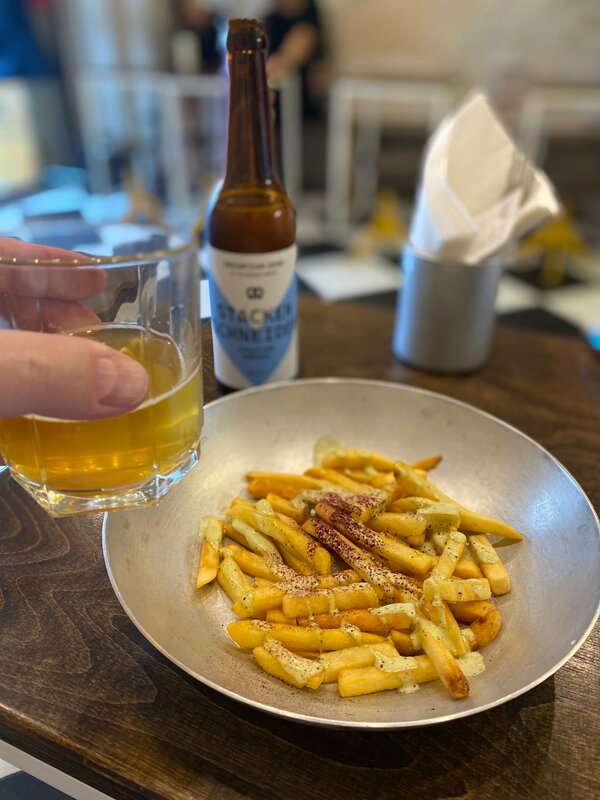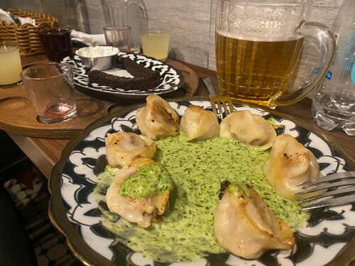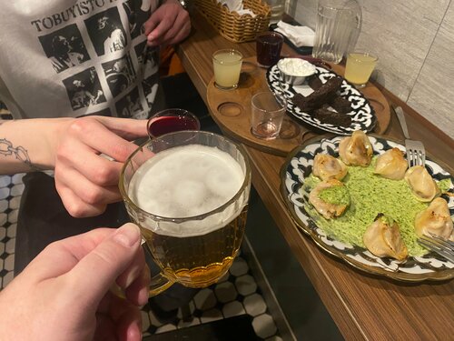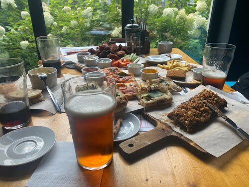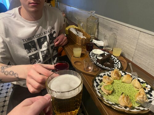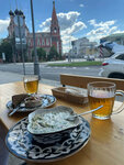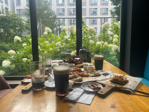 Наверное самое удачное заведение на районе для посиделок с друзьями. Сразу скажу что придя в районе 14:00 в выходной день посадка была под завязку. На 90% молодые люди, но и наблюдали старшее поколение попивающие пиво с настойками и закусывая все это чебуреками и пельмешками. Глядя на них и мы вчера преисполнились желанием повторить их заказ. Очень удобно что заказ принимают не на баре, а там где ты разместился. Пиво принесли самое первое, через минуту принесли настойки, через 10 минут гренки и пельмешки. В целом все очень, очень достойно. Чебуреки правда попробовать не удалось, т.к отдача из под ножа, и надо было ждать 40-50 минут. Но и к лучшему, будет повод наведываться к Вам почаще.