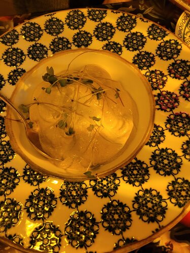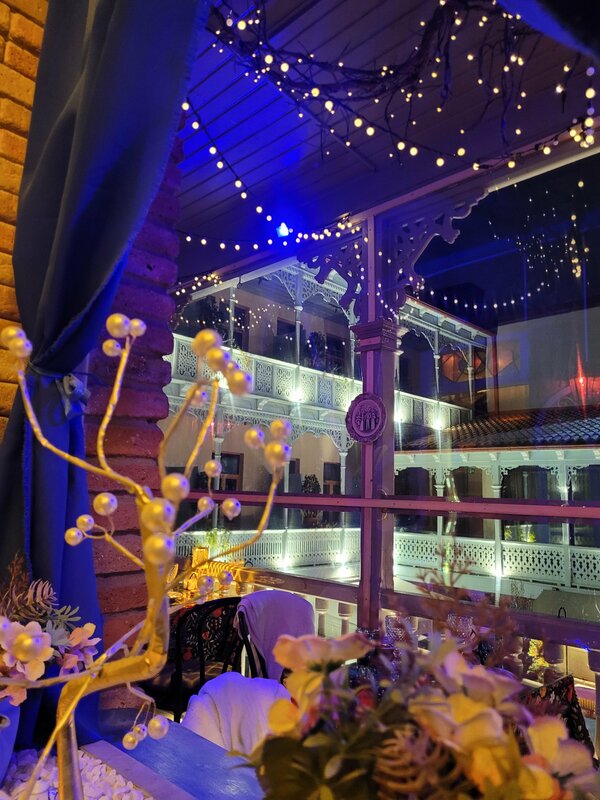 Клёвый интерьер, еда вкусная, персонал приветливый, живая игра на пианино. Вообще это оказалось самое дорогое заведение из посещенных в Тбилиси. Взяли сациви, кабаб, баклажаны и два десерта, заплатили 170 лари, 18% в чеке эээ.. Ну в меню тогда напишите ребяты, что у вас такой расклад.