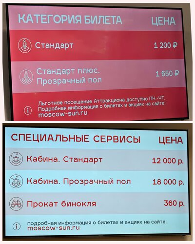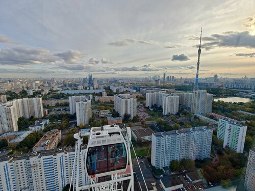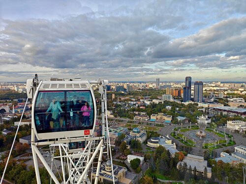 Если у вас есть свободны 30-45 минут, и до этого вы не катались, то смело можете посетить колесо обозрения. Ничего нового вы не увидите, но 1 раз прокатиться точно стоит. Чем можно улучшить эффект катания: 1. Кататься лучше после захода солнца, чтобы Москва озарила вас своими огнями, вид будет потрясающий. 2. Ещё лучше, если вы прокатитесь зимой, когда всё украшено и вокруг гирлянды: красочный каток, нарядные окна местных жителей и праздничная атмосфера сделают своё дело. 3. С собой лучше ничего не брать из еды и дополнительной атрибутики, чтобы не пришлось сдавать на досмотре. А теперь про общие впечатления: цена конечно не дешёвая, но 1 раз посетить стоит. Есть кабинки с прозрачным люком, стоят дороже, но и без него всё прекрасно видно, не вижу в них особого смысла. Внутри кабинки есть немного сидячих мест, остальные стоячие, Всё удовольствие длится чуть меньше 20 минут. После катания можно зайти в магазин с атрибутикой и сувенирами, также при входе делают совместное фото, на выходе можно купить готовое фото с рамкой или на магните 600-1000 руб, есть разные варианты на выбор. По итогу - твердые 4/5.
