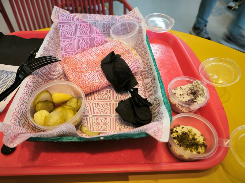 Взял себе "Кебаб в Базламе" за 490 руб. Стоит сказать, что сама шаурма вкусная. Соуса нет почти, внутри зелень, приправы и мясо. Не очень большая, но вкусная. Остальное. У меня вопрос: зачем? Зачем эти два непонятных соуса? В чем их функция к еде, к которому вы не даёте хлеб. Они просто есть и все. Их даже не съесть. Для чего эти соленья. Абслолютно не нужные элементы. Ну и напиток за 200 руб. Считаю, что дороговато для непонятного напитка. В целом, за 690 руб, как будто и не поел вовсе. 3 звёзды ставлю лишь за саму шаурму, остальное считаю непродуманным. Зачем подавать на обед людям то, что они не съедят.