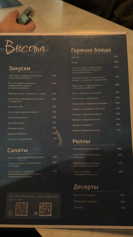 Посещали данное заведение компанией, приходим не первый раз, очень рекомендую ! Персонал приветливый, Вячеслав может дать совет и помочь с выбором. Кухня: вкусно! Есть интересные варианты роллов, пасты. Напитки: молоалкогольные оригинальные коктейли, очень понравились авторские чаи. Если вам интересен отдых в расслабленной обстановке то «Высота» для вас !