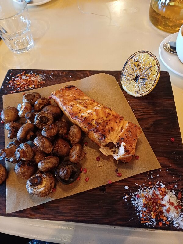 Только пришли, заказала салат овощи гриль и говядина, совершенно божественного вкуса !! Даже сфотографировать забыла) Потом был великолепный стейк лосося, рекомендую! А вот туалет средненький, но чистый)