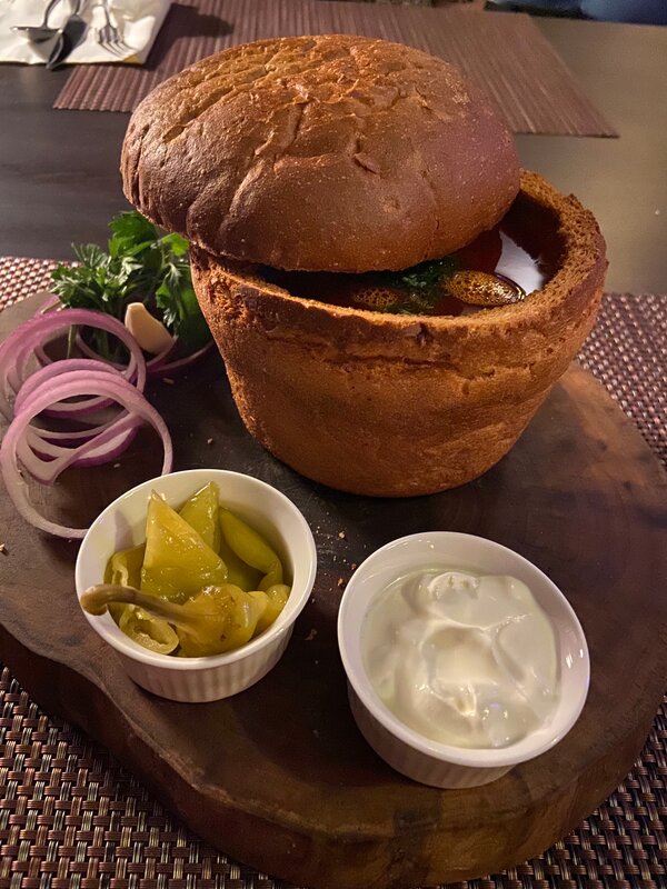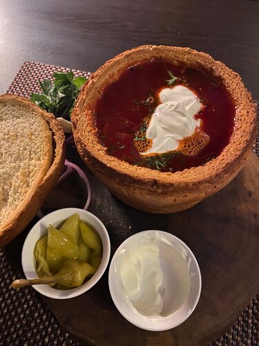 Очень крутой ресторан🔥 Замечательная и вкусная еда 😋 Добродушный персонал🤝 Круто выполнено подача борща просто пушка👍👍👍 В следующем году обязательно заеду.