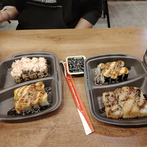 Весьма разочарована в этом заведении. Ужасный филиал и сотрудники. Набрали каких то подростков, которые только ржут и слушают музыку вместо работы(можно увидеть на камерах 12 декабря в 18:10). Ждали заказ очень долго. Должен был быть готов в 17:34, в итоге получили его только после 6 часов. Сами ролы ужас какой то. Неровные, некоторые пустые и без начинки. Т