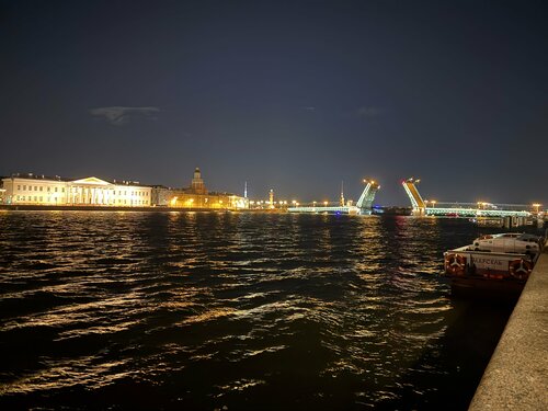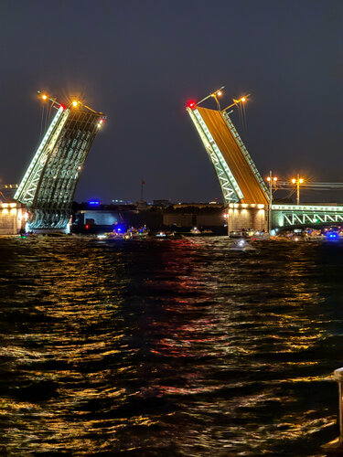 На мой взгляд, это одна из визитных карточек города. Конечно, и днём ощущаешь красоту и величие этого места, откуда открывается великолепный вид. Но ночью чувства усиливаются, так как развод Дворцового моста — это грандиозное и завораживающее зрелище! Величественные пролеты, поднимающиеся над Невой, подсветка и потрясающая атмосфера ночного Петербурга создают невероятное зрелище. Обязательно к посещению! Мы наблюдали за разводом Дворцового и Благовещенского мостов в ночь с 07 на 08 августа. Всё прошло строго по расписанию, которое я нашла в интернете.