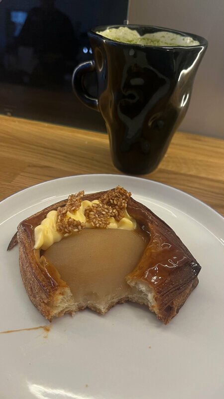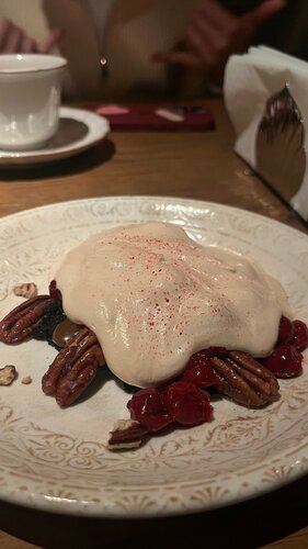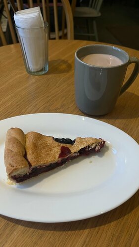 Изначально шла ради сырников, так как видела в меню несколько видов на разных платформах. К сожалению, на месте оказалось, что их уже убрали, хотя информация в интернете не обновлена - это сильно расстроило. Взяла спайси какао и вишнёвый пирог. В целом вкусно: какао интересное, с пряной ноткой, пирог тоже неплохой. Но в пироге попалась косточка, что немного испортило впечатление. В итоге место приятное, но есть вопросы к актуальности меню и вниманию к деталям.
