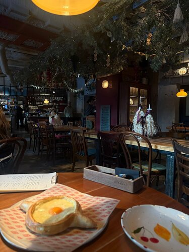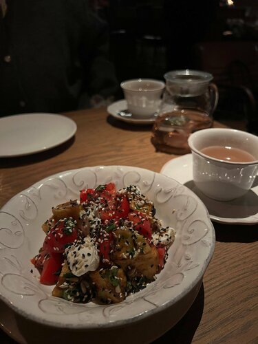 Заказывали хачапури по-мегрельски, салат с хрустящими баклажанами и томатами, чай и сметанник. Больше всего понравилось именно пирожное - очень нежное и вкусное, приятный баланс сладости. Ради десерта точно можно вернуться. Остальные блюда были нормальные: хачапури сытный, салат свежий, но без яркого «вау». Интерьер красивый и атмосферный, приятно провести время. В целом хорошее место, оценила бы на 4 звезды.