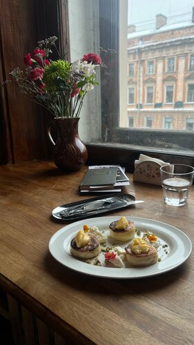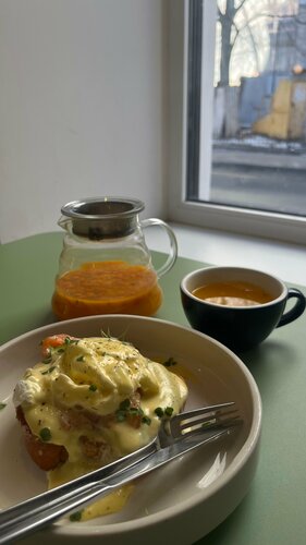 В этот раз были с парнем - впечатления остались очень приятные. Заказывали кофе, драники с лососем и английский маффин с котлетой. Драники особенно порадовали: с хрустящей корочкой и нежные внутри, отлично сочетаются с лососем. Маффин тоже вкусный, сытный и хорошо сбалансированный. Кофе достойный, приятно дополнил завтрак. Интерьер красивый и уютный, атмосфера располагает спокойно посидеть. Персонал дружелюбный, обслуживание внимательное. Из небольших минусов - цены: те же блюда в филиалах Петербурга стоят дешевле. В целом - хорошее место для завтрака, сюда хочется вернуться