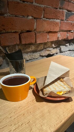 Попробовала брусничный фильтр - свежий с лёгкой ягодной кислинкой, а к нему гриль‑чиз с трюфельным омлетом и камамбером - очень вкусно! В целом гриль‑чизы здесь просто супер. Особенно приятно расположиться на свежем воздухе на террасе и наслаждаться кофе в хорошую погоду. Бариста приветливые, место уютное - обязательно вернусь за новыми вкусами!