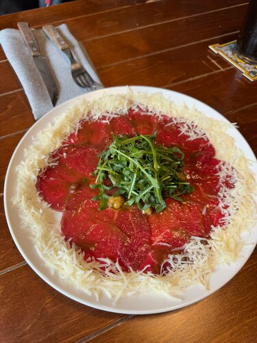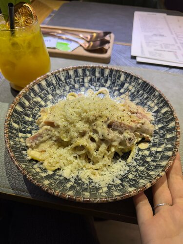 Вкусный салат с баклажанами, лимонад манго-маракуйя. В карбонаре очень много недожаренного бекона и отсекшиеся сливки (опустим тот факт, что классический рецепт не предполагает сливок в этом блюде). Но важно не это, а то, как официанты относятся к гостям. Мы с мч сделали заказ одновременно, предполагая, что принесут либо обоим сразу, либо с небольшой задержкой. В итоге мне принесли весь заказ за 15 минут, а моему мч принесли только пиво. В итоге прошло ещё 15 минут, я уже почти наелась всем, что принесли (порции большие, доесть до конца не представилось возможным), а ему до сих пор не принесли ни закуску, ни горячее. На наши вопросы официант отвечала одно слово: «Готовится». Что готовится, сколько времени оно ещё будет готовиться — было непонятно, пока я не нашла администратора заведения и не уточнила у неё, почему нас не предупредили о времени приготовления закуски (которая в итоге оказалась ещё и невкусной). На это хотя бы нашлось решение и извинение администратора и закуска включена в меню не была. Но вечер был испорчен: надеялись хорошо провести время и ВМЕСТЕ поесть, а как итог пришлось есть по очереди, ещё и не самый вкусный вариант еды попался конкретно моему мч. 2 звезды только за то, что администратор попыталась урегулировать вопрос и не включила закуску в счёт.