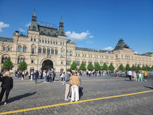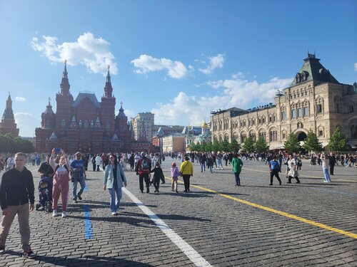 Большая, красная площадь. Много туристов в любое время года, рядом ГУМ, ЦУМ, множество мест для фото на память, самые красивые виды на закате и рассвете.